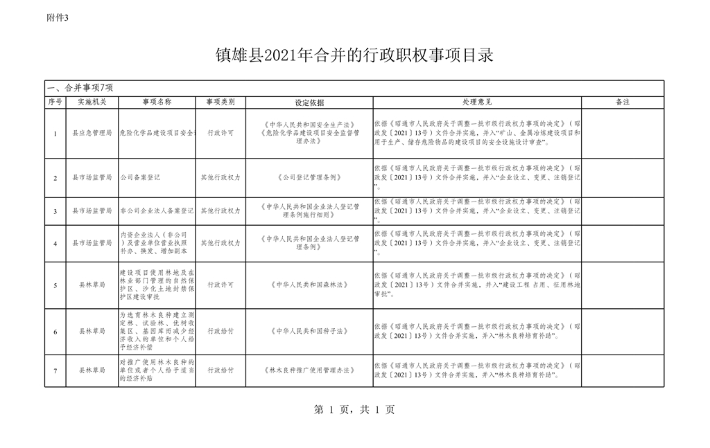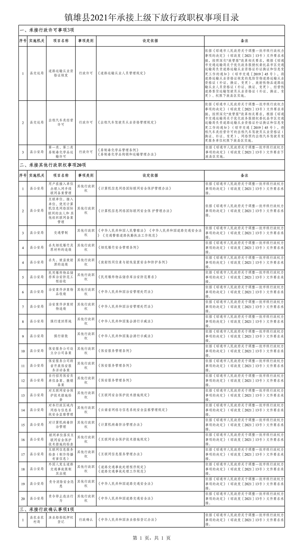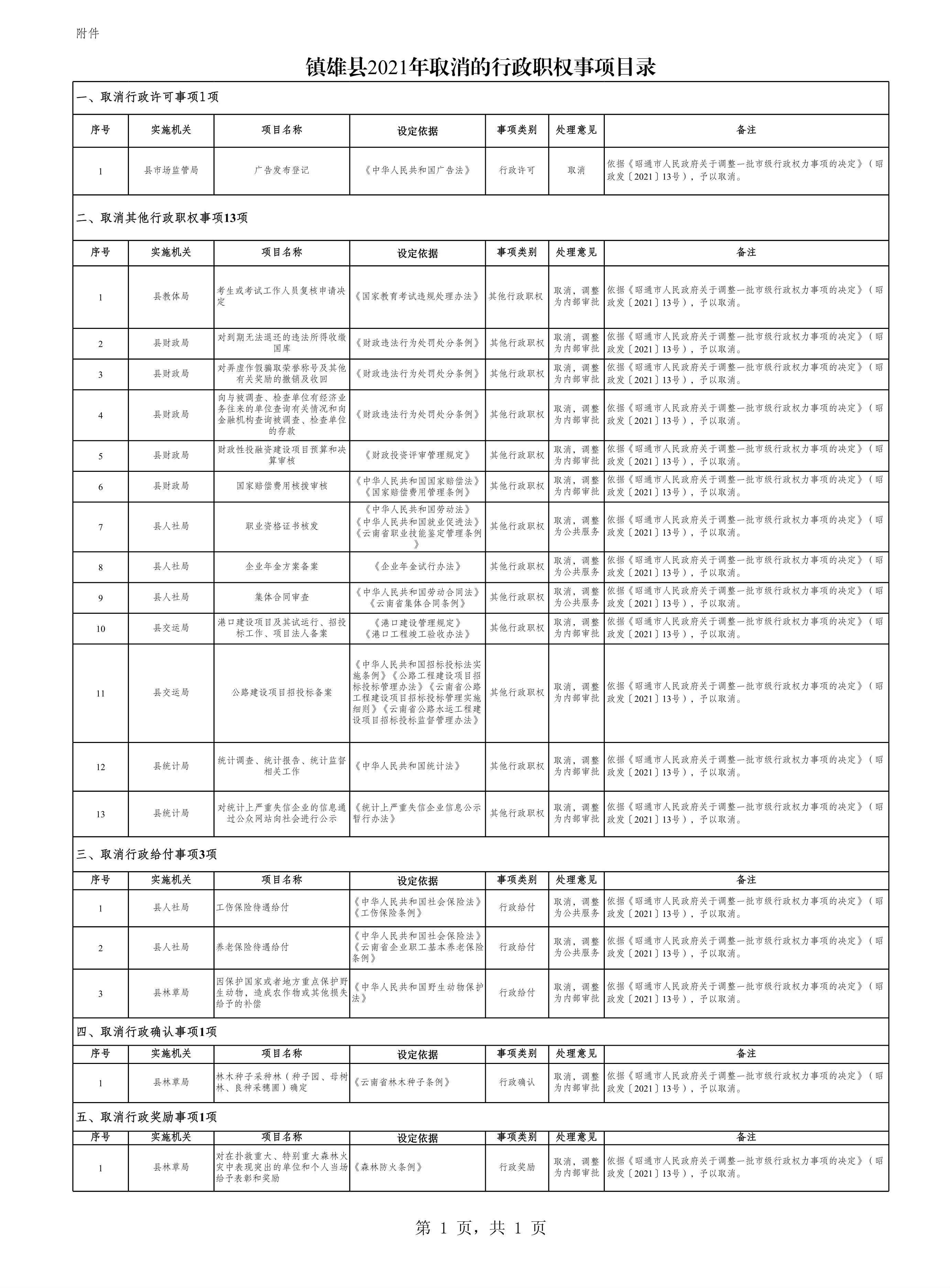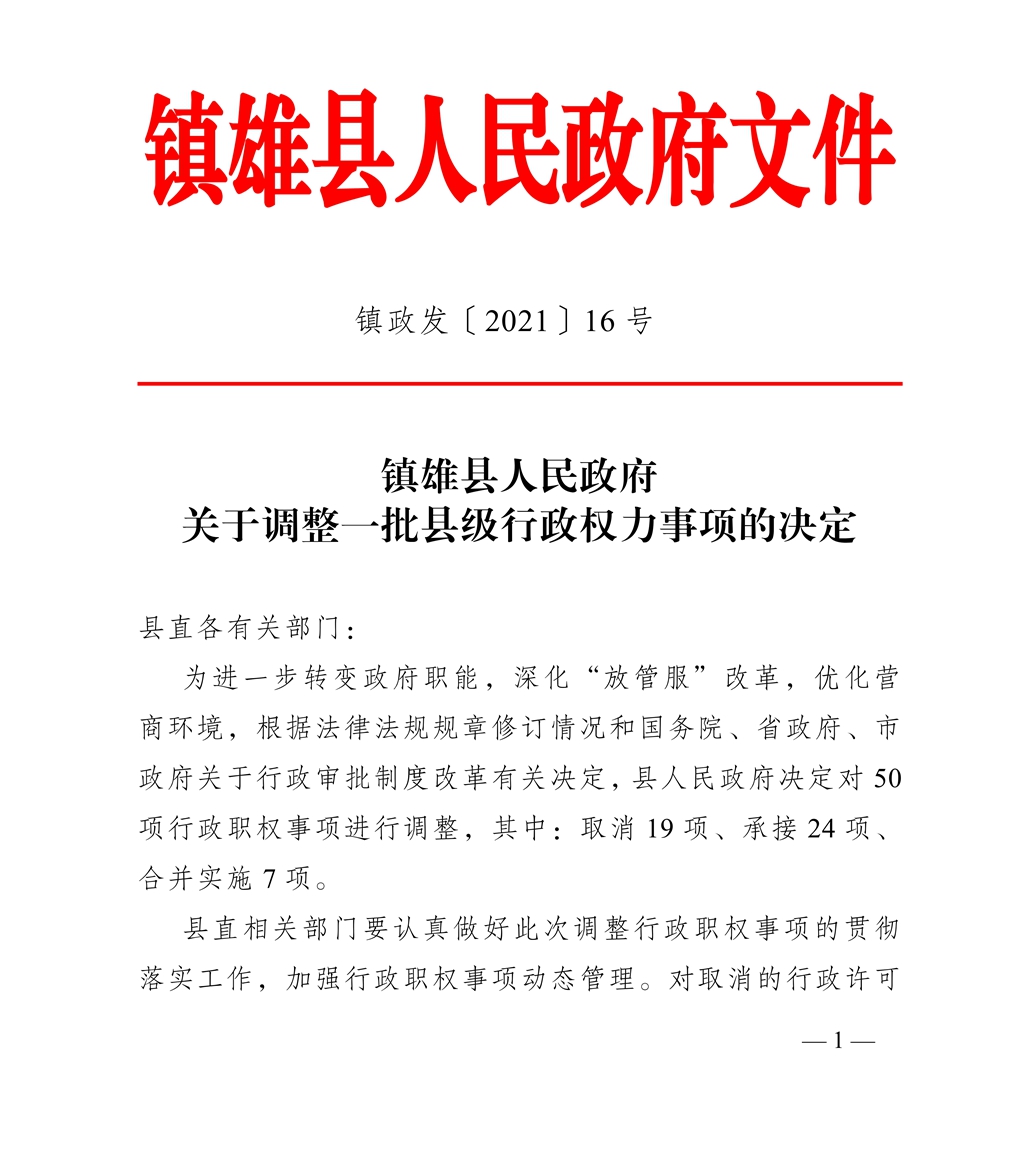 鎮(zhèn)雄縣人民政府關(guān)于調(diào)整一批縣級行政權(quán)力事項的決定