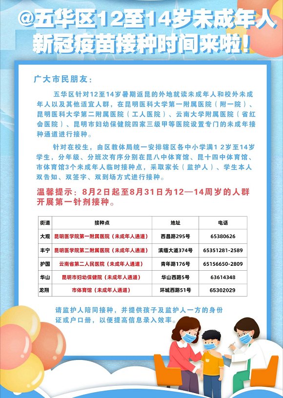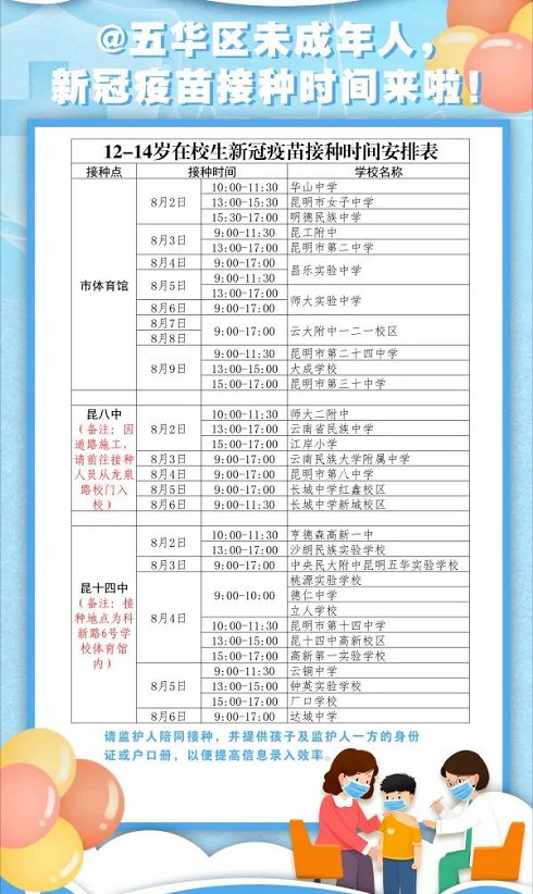 為更好的保護孩子,確保校園疫情防控安全,五華區(qū)應對疫情指揮部在7月中旬圓滿完成對轄區(qū)內(nèi)15-17歲未成年接種的基礎上,結(jié)合全區(qū)疫情防控實際,計劃從8月2日起開始對轄區(qū)內(nèi)12歲—14歲未成年人接種新冠疫苗,同時對上一階段未接種的15—17歲未成年人進行補種。