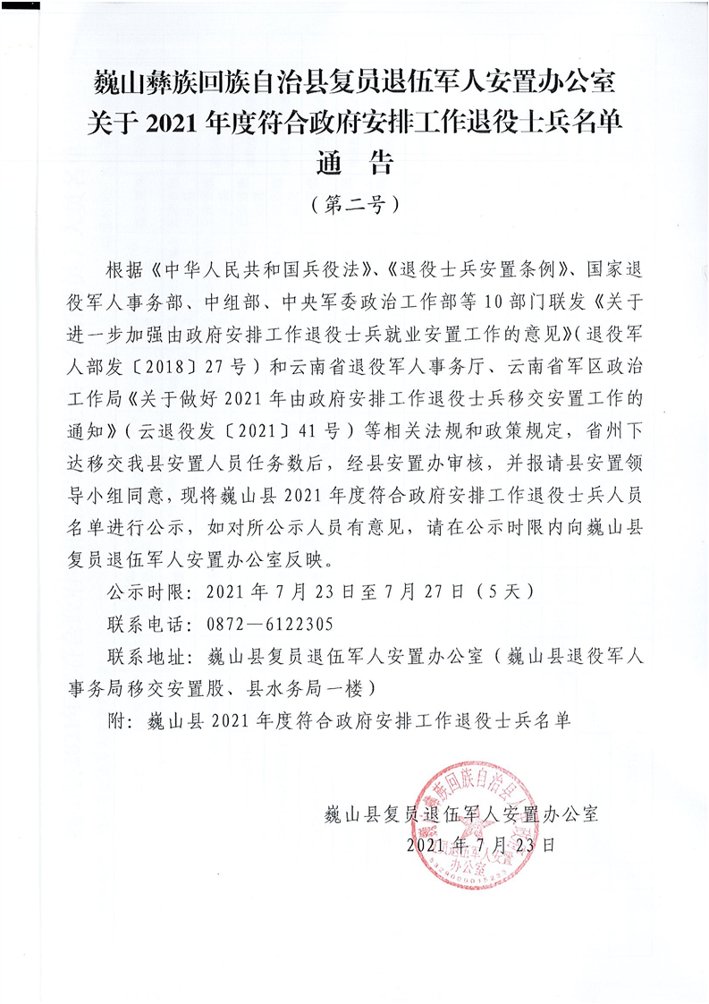 大理州巍山彝族回族自治縣復(fù)員退伍軍人安置辦公室關(guān)于巍山縣2021年度符合政府安排工作退役士兵名