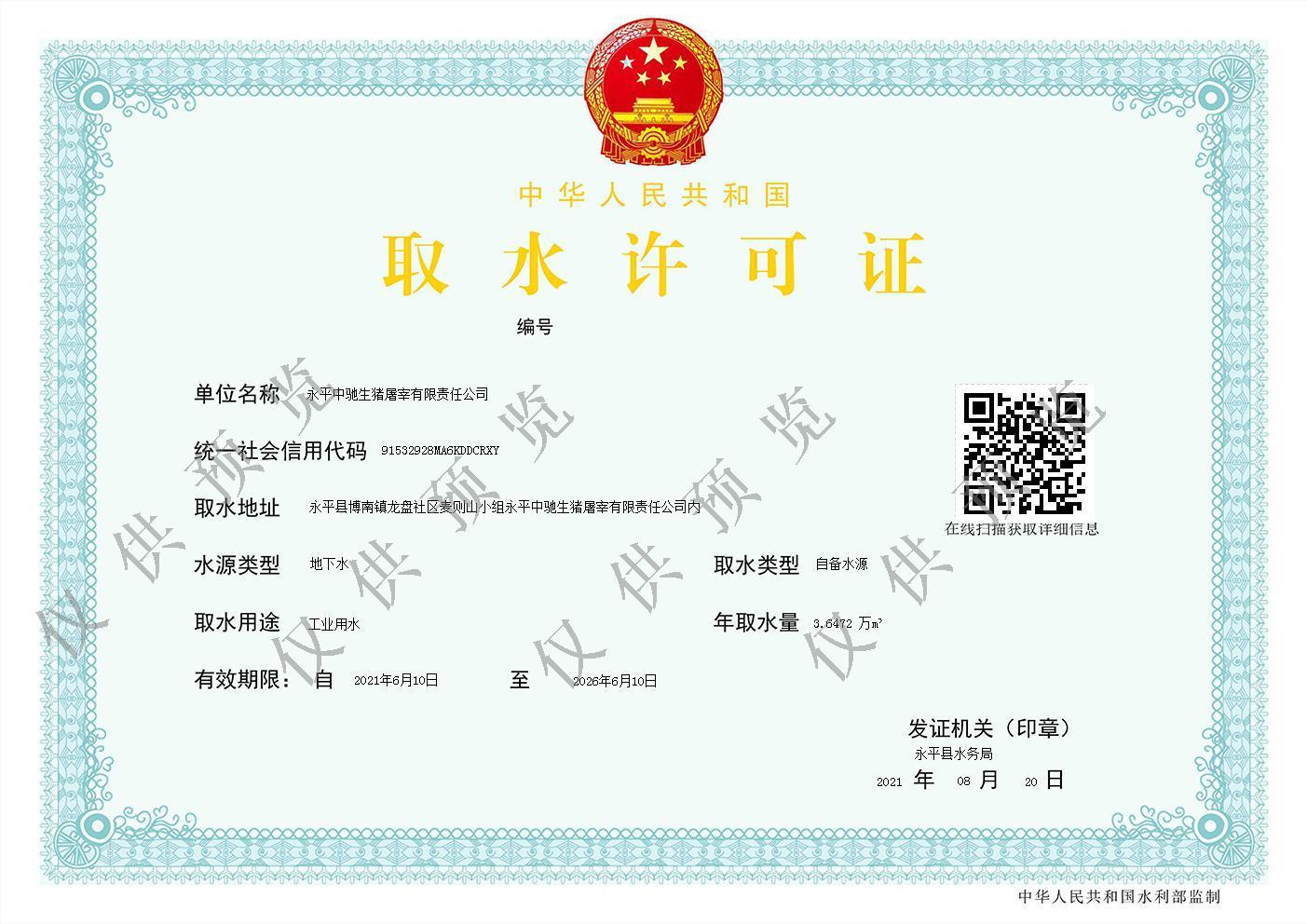 永平縣水務(wù)局關(guān)于給予永平中馳生豬屠宰有限責(zé)任公司生豬定點(diǎn)屠宰場(chǎng)應(yīng)急水源建設(shè)項(xiàng)目核發(fā)取水許可證的行政許可決定