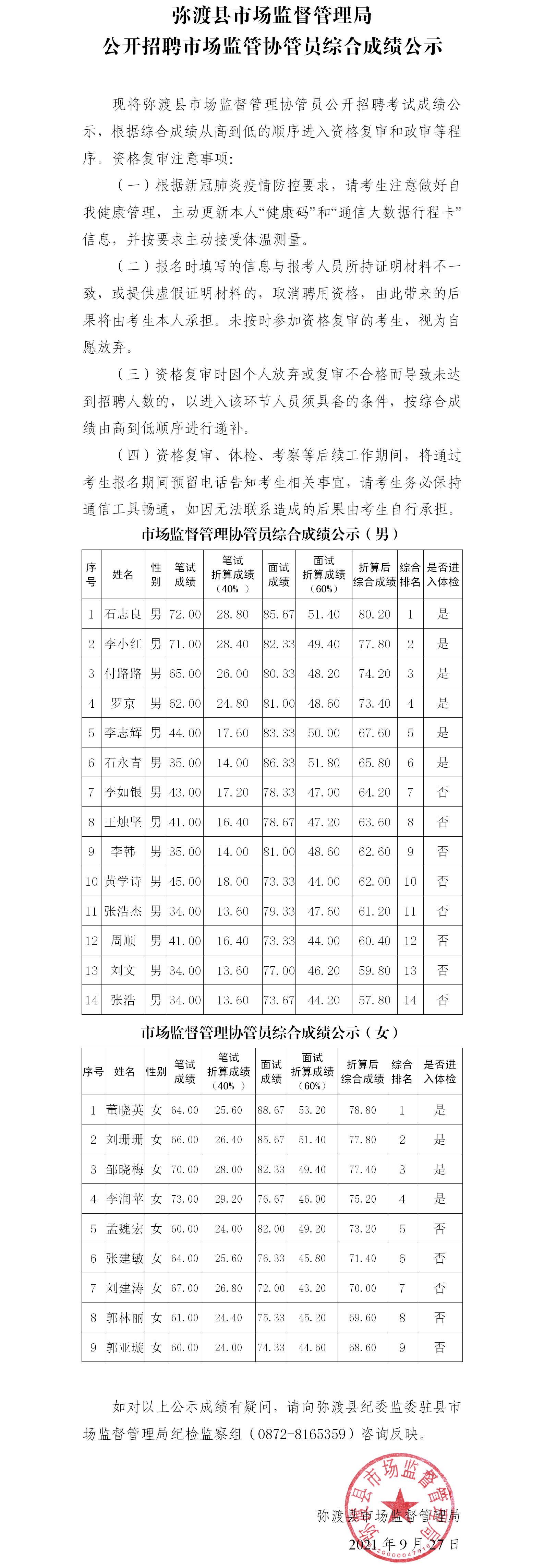 昆明市彌渡縣市場(chǎng)監(jiān)督管理局公開(kāi)招聘市場(chǎng)監(jiān)管協(xié)管員綜合成績(jī)公示