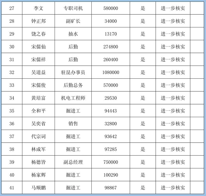 4、復核組意見:①煤礦管理方新提交的5份5人627萬元欠薪資料因證據(jù)不足暫緩確認;②羅克雄1415434元雖然提供的證據(jù)充足,但由于他是公司的總經(jīng)理且金額較大,需要再次確認;③其他40條欠薪證據(jù)屬實,涉及40人2534935元可以確認。