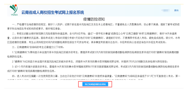 5.這時(shí)考生要注意頁(yè)面通知內(nèi)容,認(rèn)真閱讀《疫情防控須知》,點(diǎn)擊“我已知曉疫情防控須知”按鈕。