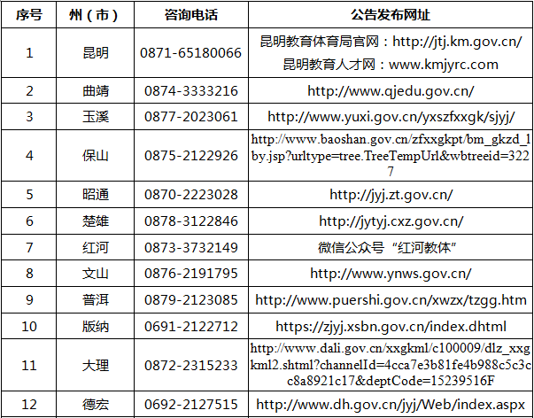 云南各州市中小學(xué)教師資格認(rèn)定公告的查詢網(wǎng)址及聯(lián)系方式