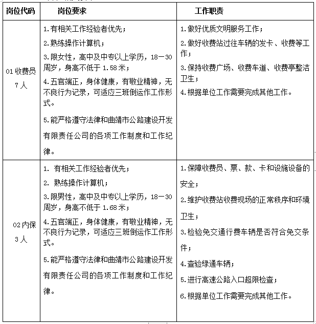 本次面向社會公開招聘,招聘人數(shù)10人:收費(fèi)員7人,內(nèi)保3人。
