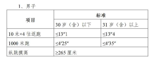 資格審核合格的人員進(jìn)入體能測試,體能測試按照公安部《關(guān)于印發(fā)公安機(jī)關(guān)錄用人民警察體能測評項(xiàng)目和標(biāo)準(zhǔn)(暫行)的通知》及其所附標(biāo)準(zhǔn)開展。體能測試的項(xiàng)目如下: