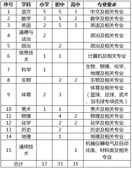 根據(jù)學(xué)校發(fā)展需要,決定面向社會公開招聘小學(xué)、初中、高中各學(xué)科教師65名,現(xiàn)將相關(guān)事宜公告如下: